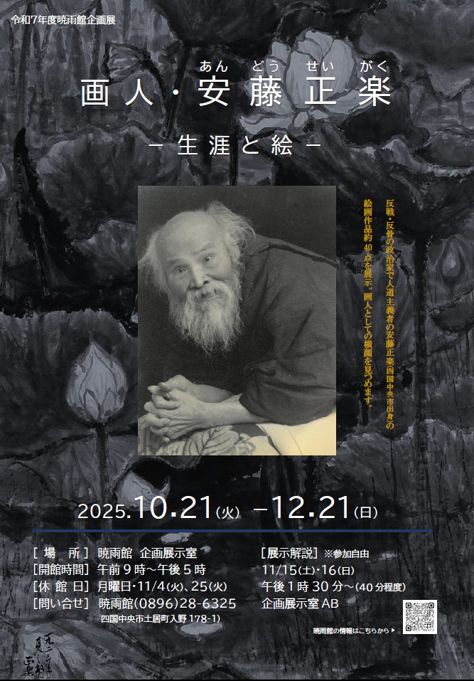 ふるさと宇摩の歴史や文化などを紹介・展示する暁雨館(郷土資料館)には、「近藤篤山」「永隆院(お作さん)」「安藤正楽」など郷土の偉人を紹介するとともに、岩石・鉱物の宝庫と言われる赤石山系や関川産出の岩石・鉱物標本も展示しております。