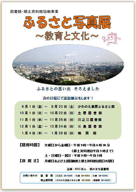NPO法人 紙のまち図書館 > 新着情報 > 巡回 ふるさと写真展を開催します。 巡回 ふるさと写真展を開催します。 2017.10.01更新 イベント 川之江図書館,三島図書館,土居図書館,おやこ図書館,かわのえ高原ふるさと館,暁雨館 図書館・郷土資料館協働事業 「巡回 ふるさと写真展~教育と文化~」 9月より図書館と郷土資料館にて巡回展示をします。 日時場所:かわのえ高原ふるさと館 9月1日(金)~23日(土) 土居図書館 10月1日(金)~10月22日(日) 川之江図書館 11月1日(水)~11月26日(日) 三島図書館 12月1日(金)~12月24日(日) 暁雨館 1月4日(木)~1月28日(日) 主催:NPO法人 紙のまち図書館