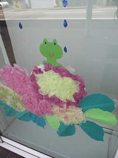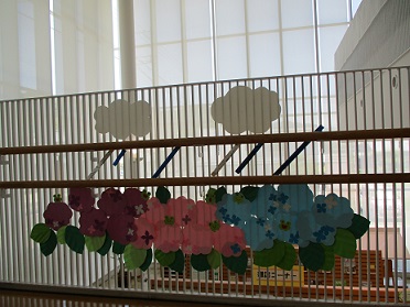 川之江図書館の玄関に、きれいなあじさいが咲きました。