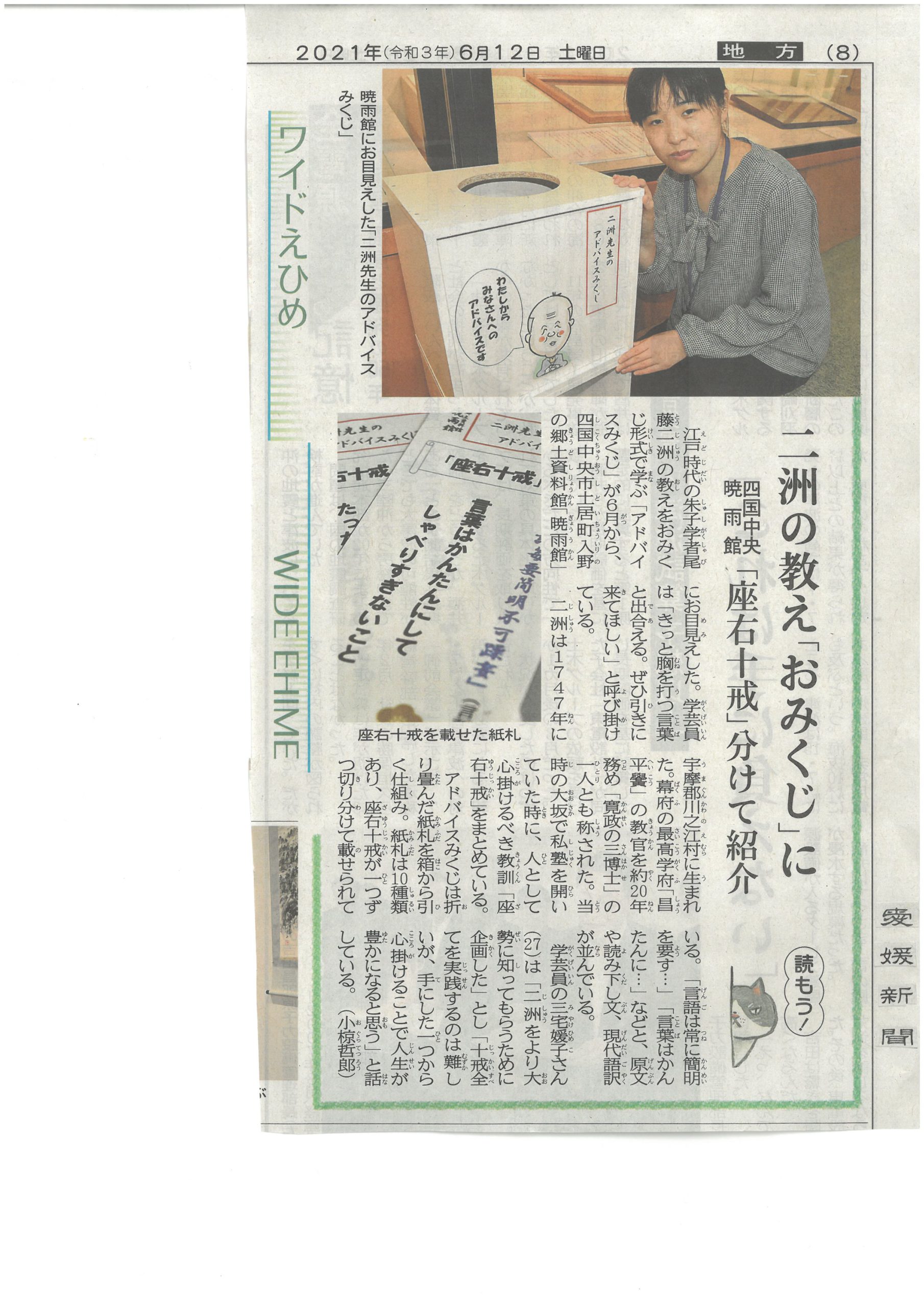 NPO法人 紙のまち図書館 > 新着情報 > 新聞に載りました(^^♪ 新聞に載りました(^^♪ 2021.06.15更新 お知らせ 暁雨館 6月12日(土)付けの愛媛新聞に“二洲の教え「おみくじ」に”という 見出しで新企画「二洲先生のアドバイスみくじ」の記事が掲載されま ました。三宅学芸員の「手にした一つから心掛けることで人生が豊か になると思う」というコメントも載っています。時事を掲載いたしま すので、ぜひ、お読みください。 2021年6月12日付愛媛新聞 掲載許可番号:d20210614-01
