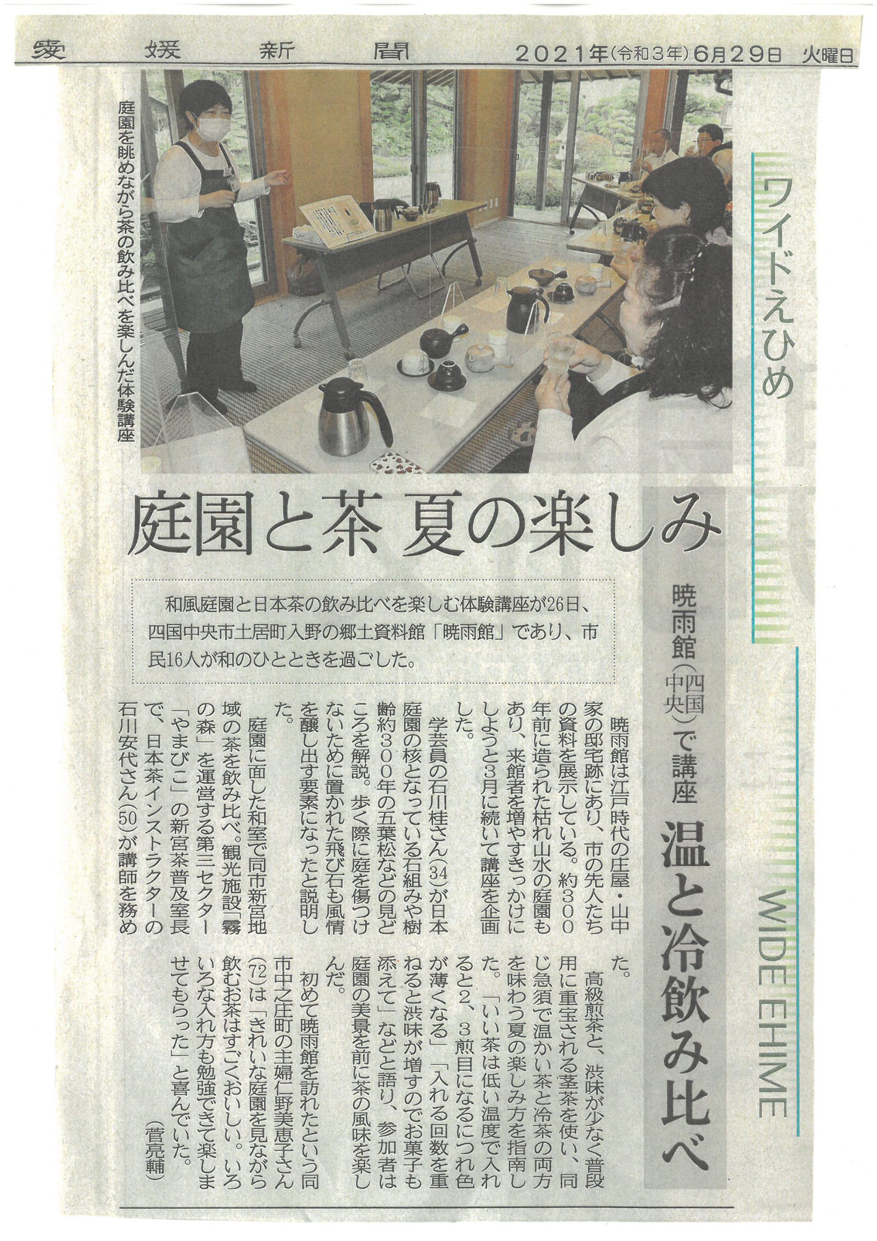 NPO法人 紙のまち図書館 > 新着情報 > 新聞に載りました(^^♪ 新聞に載りました(^^♪ 2021.06.30更新 お知らせ 暁雨館 6月26日(土)に行われた「庭を愛でる~日本茶インストラクターとお茶を楽しみながら」の記事が「庭園と茶 夏の楽しみ」の見出しとともに 6月29日付の愛媛新聞に掲載されました。 2021年6月29日付愛媛新聞 掲載許可番号:d20210630-01