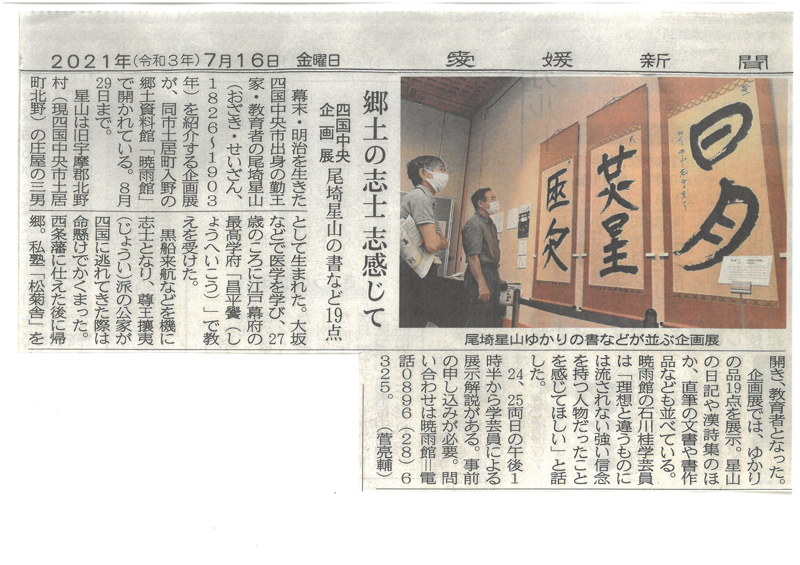 NPO法人 紙のまち図書館 > 新着情報 > 新聞に載りました(^^♪ 新聞に載りました(^^♪ 2021.07.16更新 お知らせ 暁雨館 7月16日付の愛媛新聞に企画展「四国中央市出身の勤王家・教育者 尾埼星山」の記事が掲載されました。企画展が始まって10日余りが 経ちますが、連日たくさんのお客様に来ていただいております。あ りがとうございます。「愛石のススメ展」も同時開催しております ので、この週末はぜひ、暁雨館へ足をお運びください。お待ちして おります。 2021年7月16日付愛媛新聞 掲載許可番号:d20210716-05