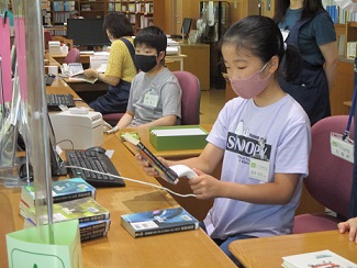 お待ちかね、カウンターでの本の貸出と返却の「ピッ、ピッ!」は、お客さんを前に緊張しながらも