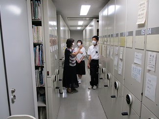 初日、まずは館長から館内の説明を受けました。普段入ることのない閉架書架(書庫)などを