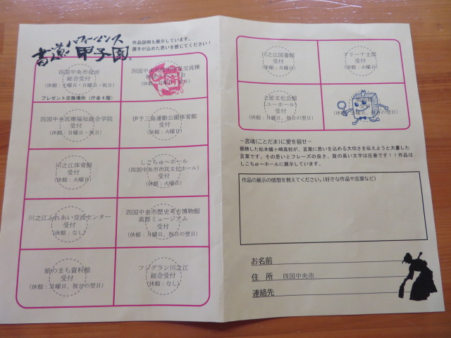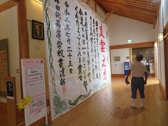 本日からスタートした「第14回書道パフォーマンス甲子園スタンプラリー」で暁雨館第1号のお客さんがおいでました。お話を聞いてみると、目標は今日中に14館制覇とのことで、張り切っていました。賞品のマグカップは、孫娘さんにプレゼントされるそうです。がんばれ、おじいちゃん!