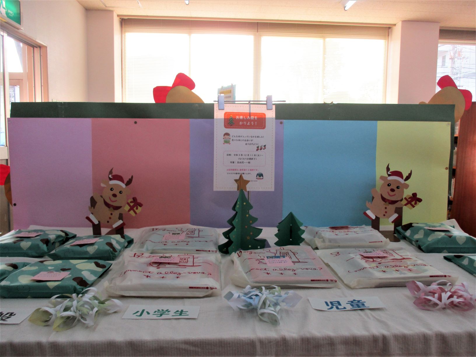 NPO法人 紙のまち図書館 > 新着情報 > お楽しみ袋をかりようを開催しています! お楽しみ袋をかりようを開催しています! 2021.12.11更新 イベント おやこ図書館 12月11日(土)からおやこ図書館では 乳児・児童・小学生・一般向けに 一袋に3冊つづ入った「お楽しみ袋」を 貸出しています。 なくなり次第終了の予定です。 皆様のご利用をお待ちしています。