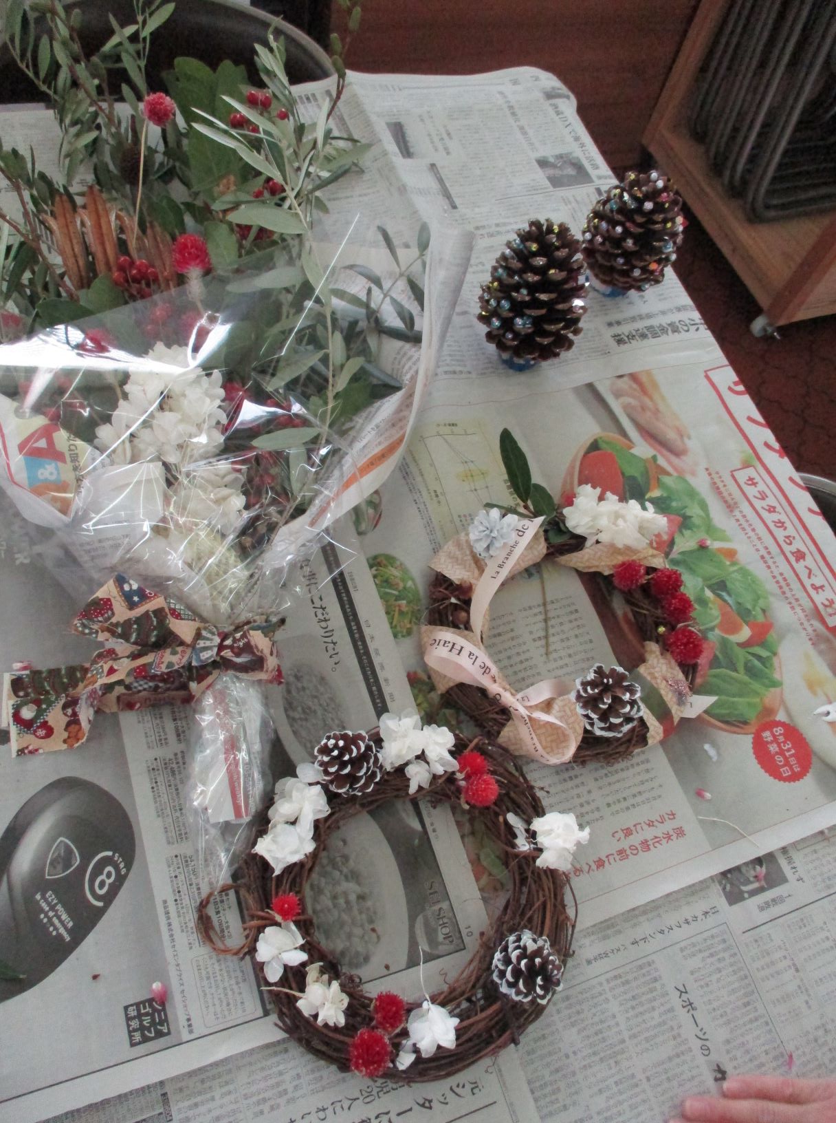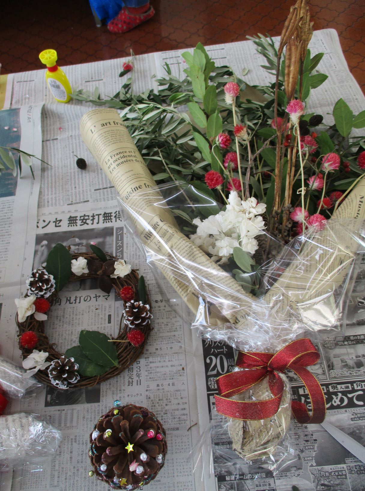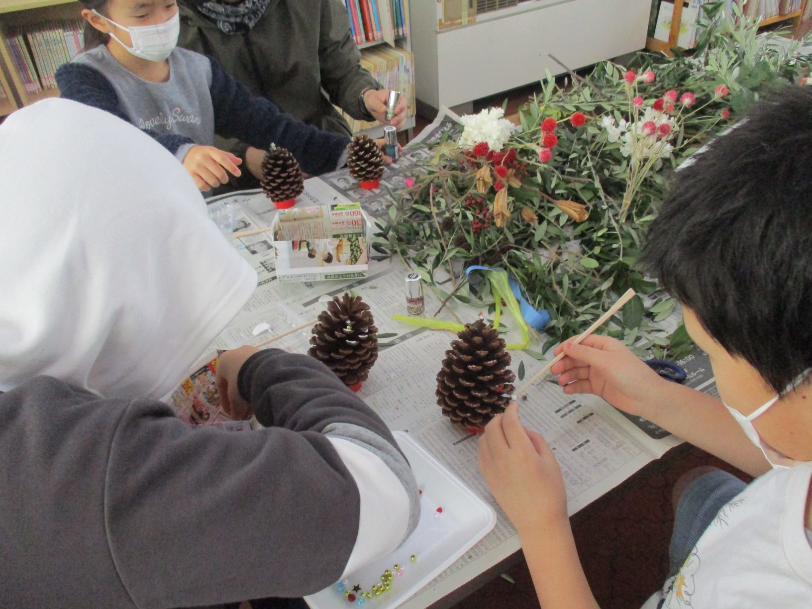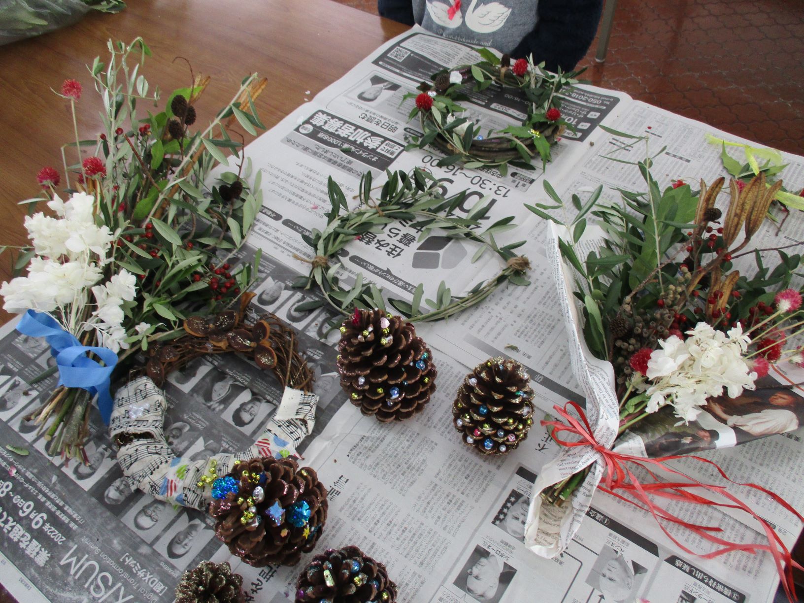 ドライフラワーや松ぼっくり、ビーズやリボンを使って
