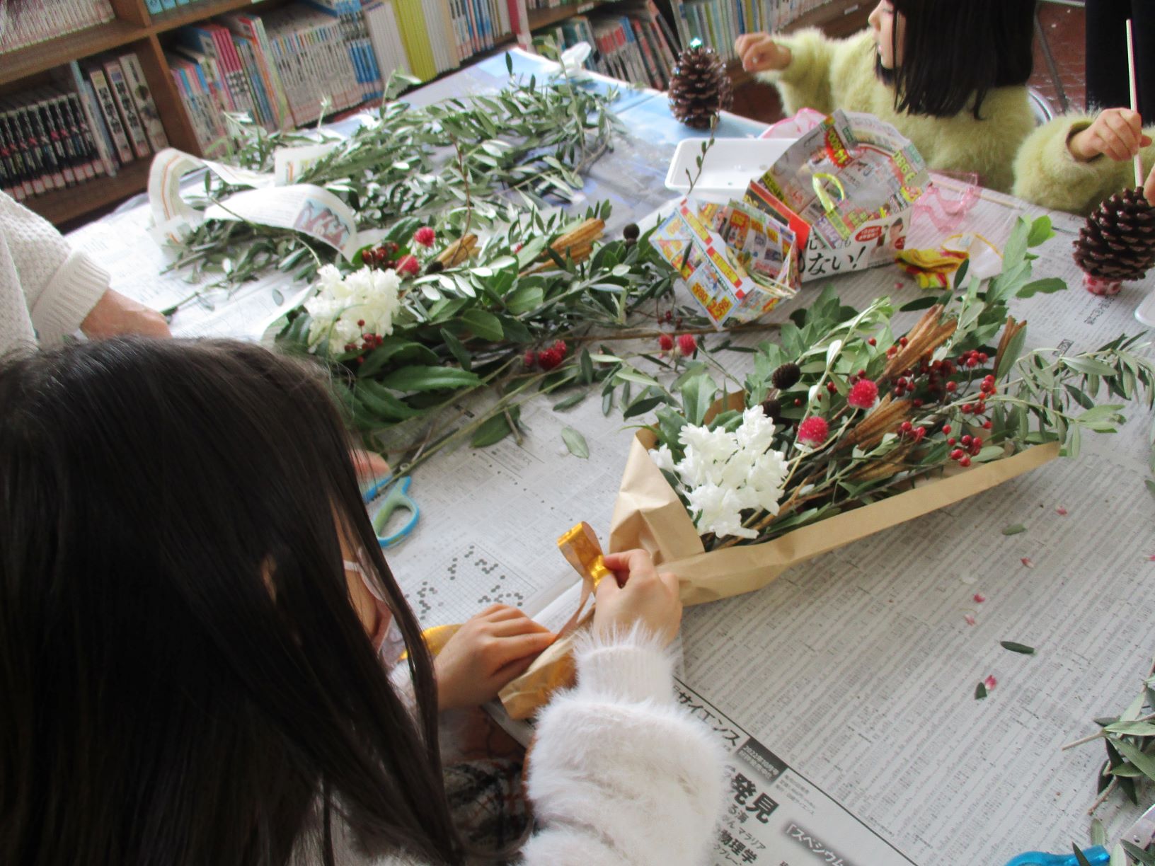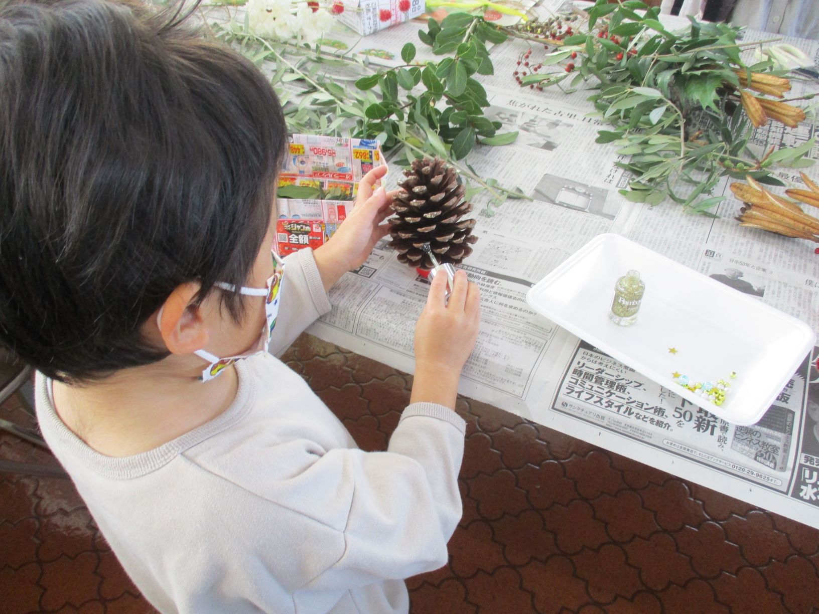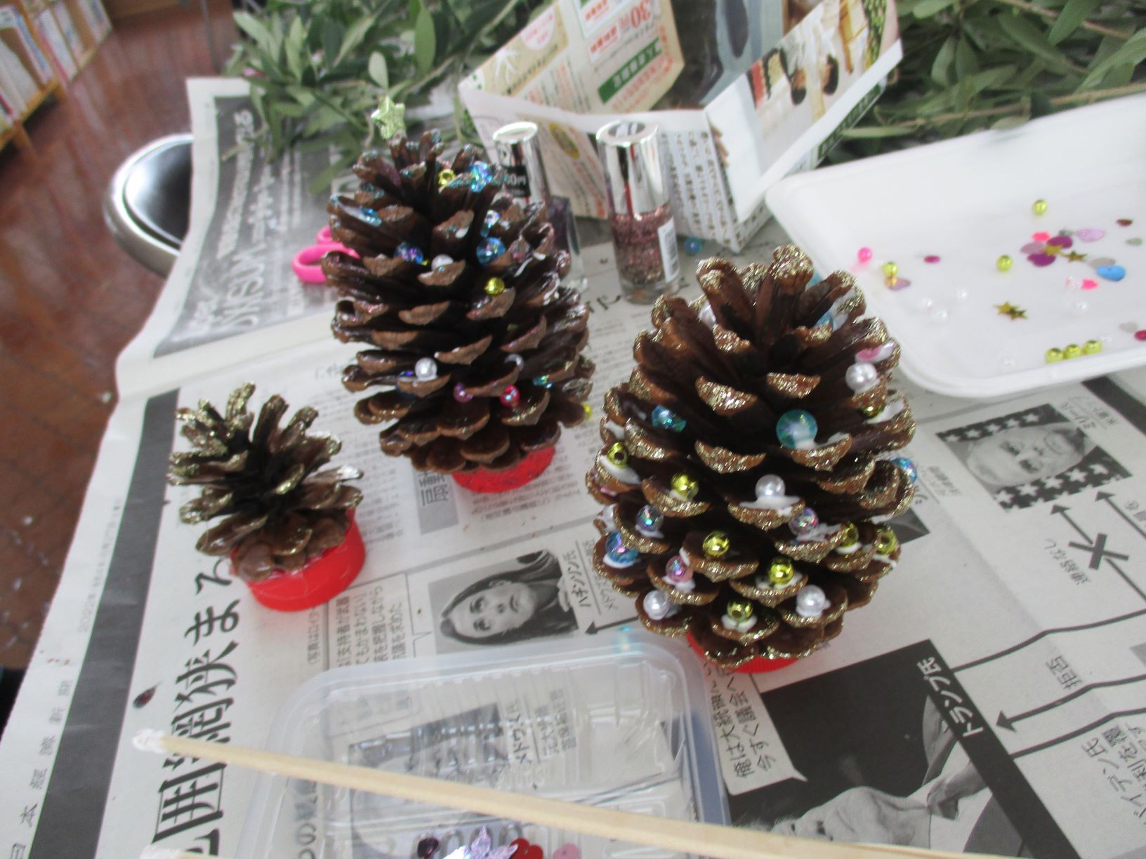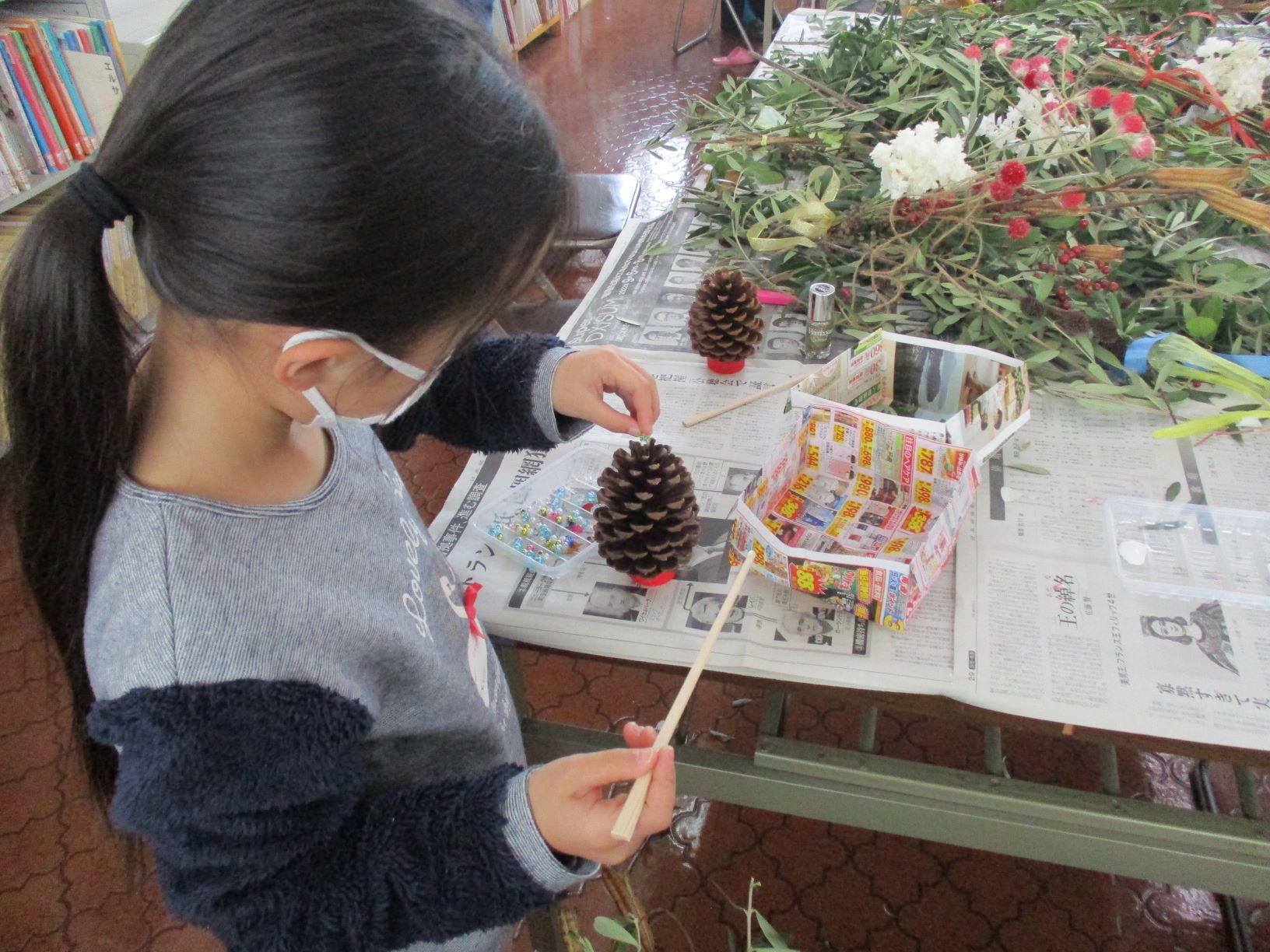 ドライフラワーや松ぼっくり、ビーズやリボンを使って