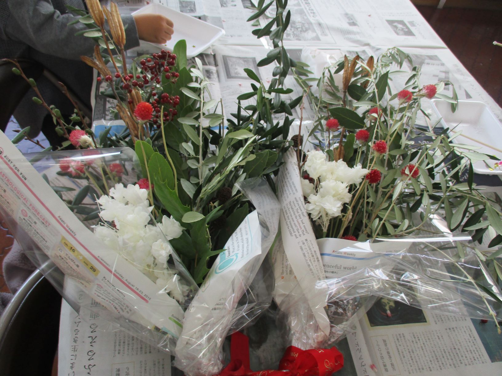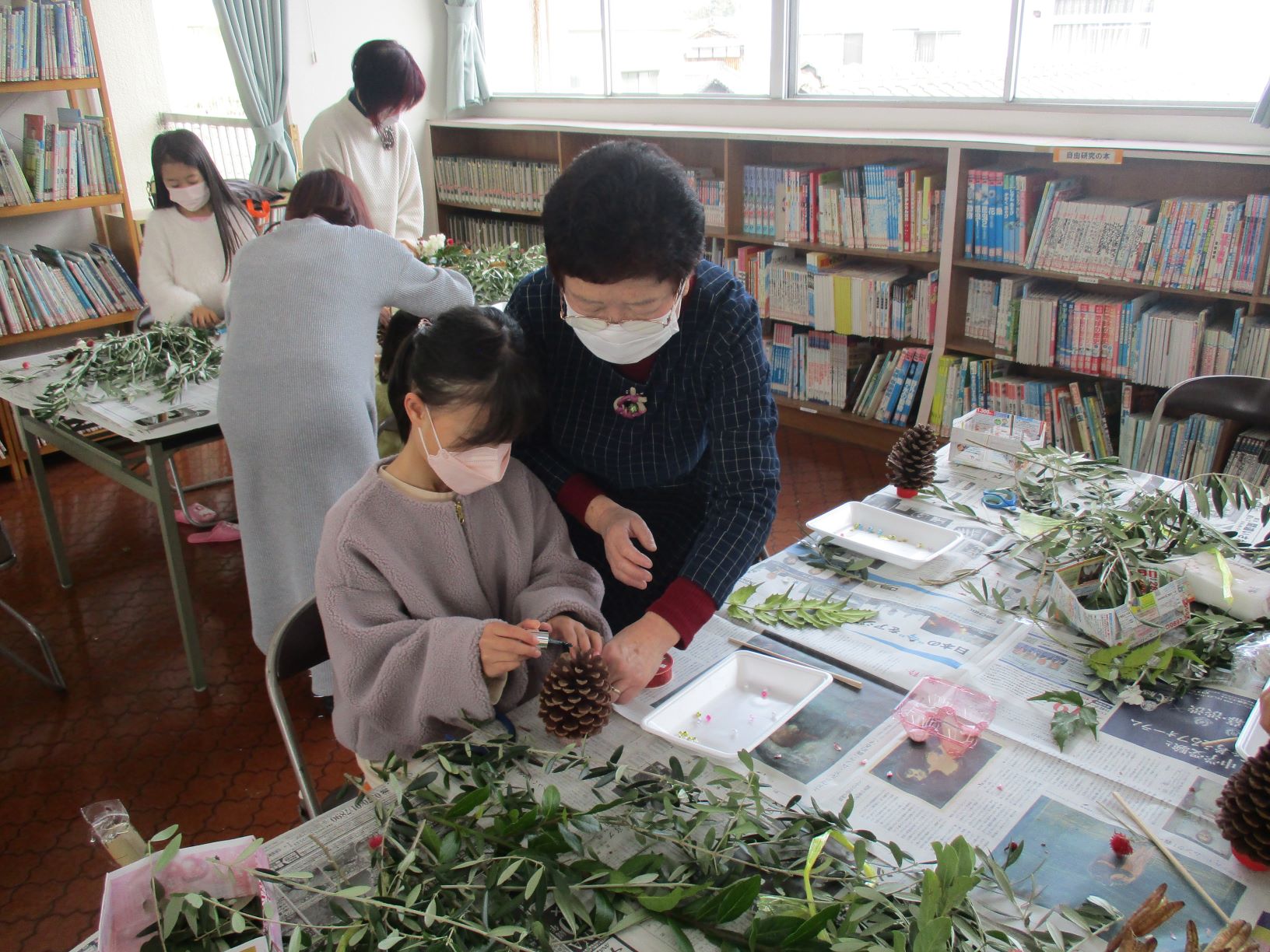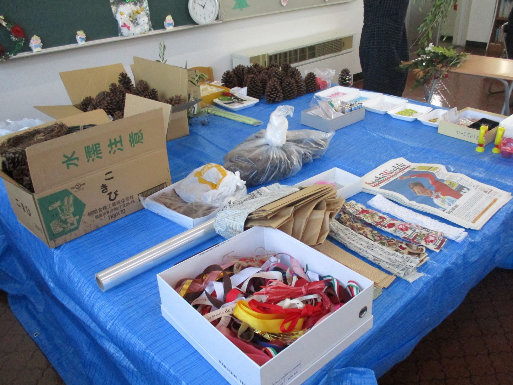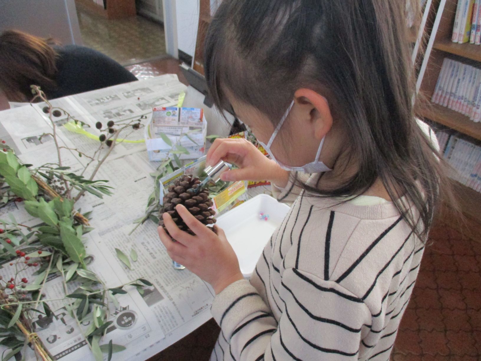 ドライフラワーや松ぼっくり、ビーズやリボンを使って
