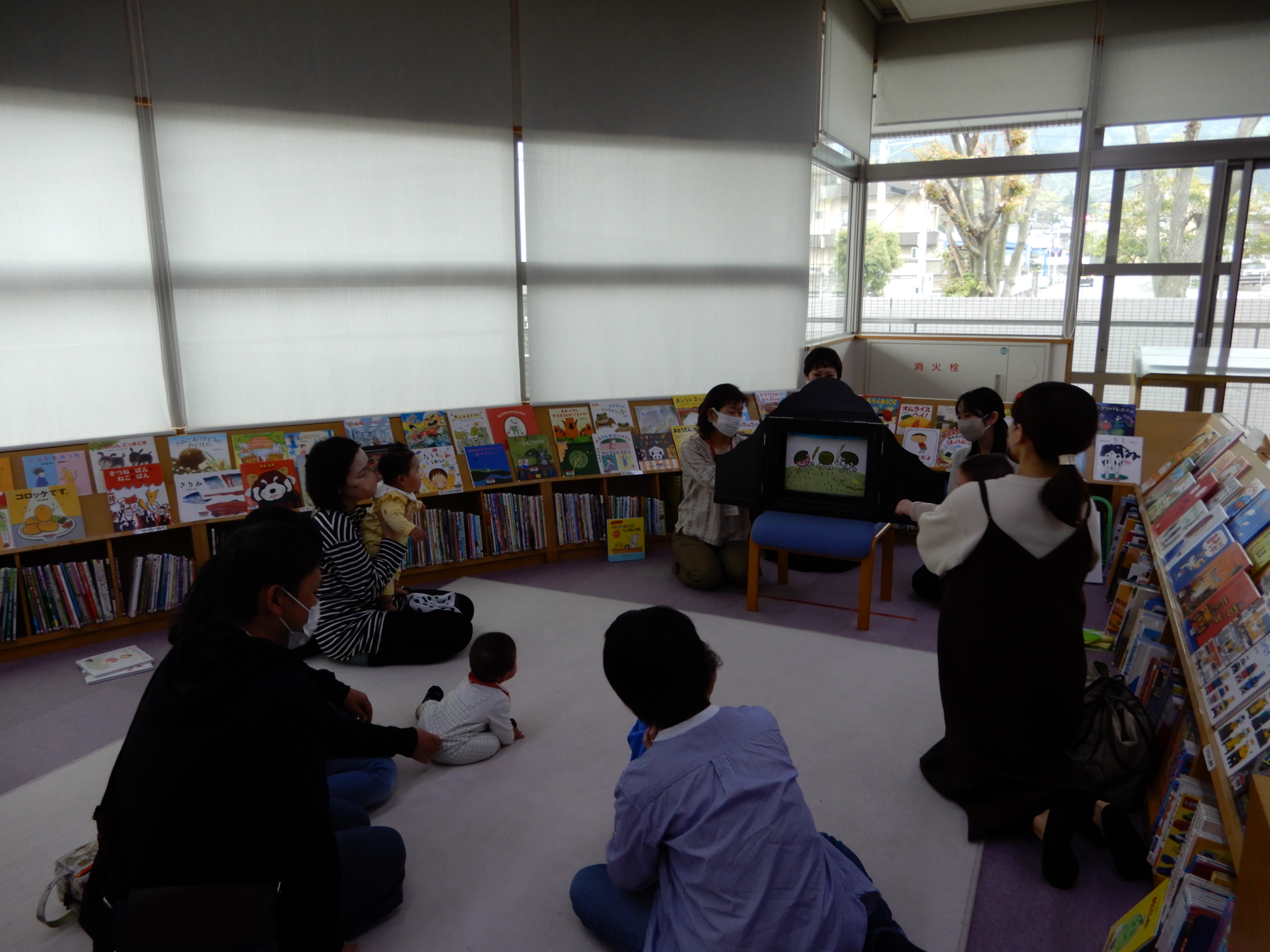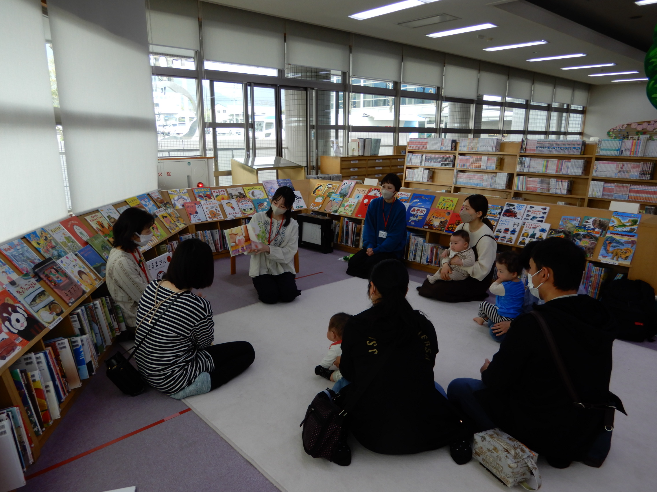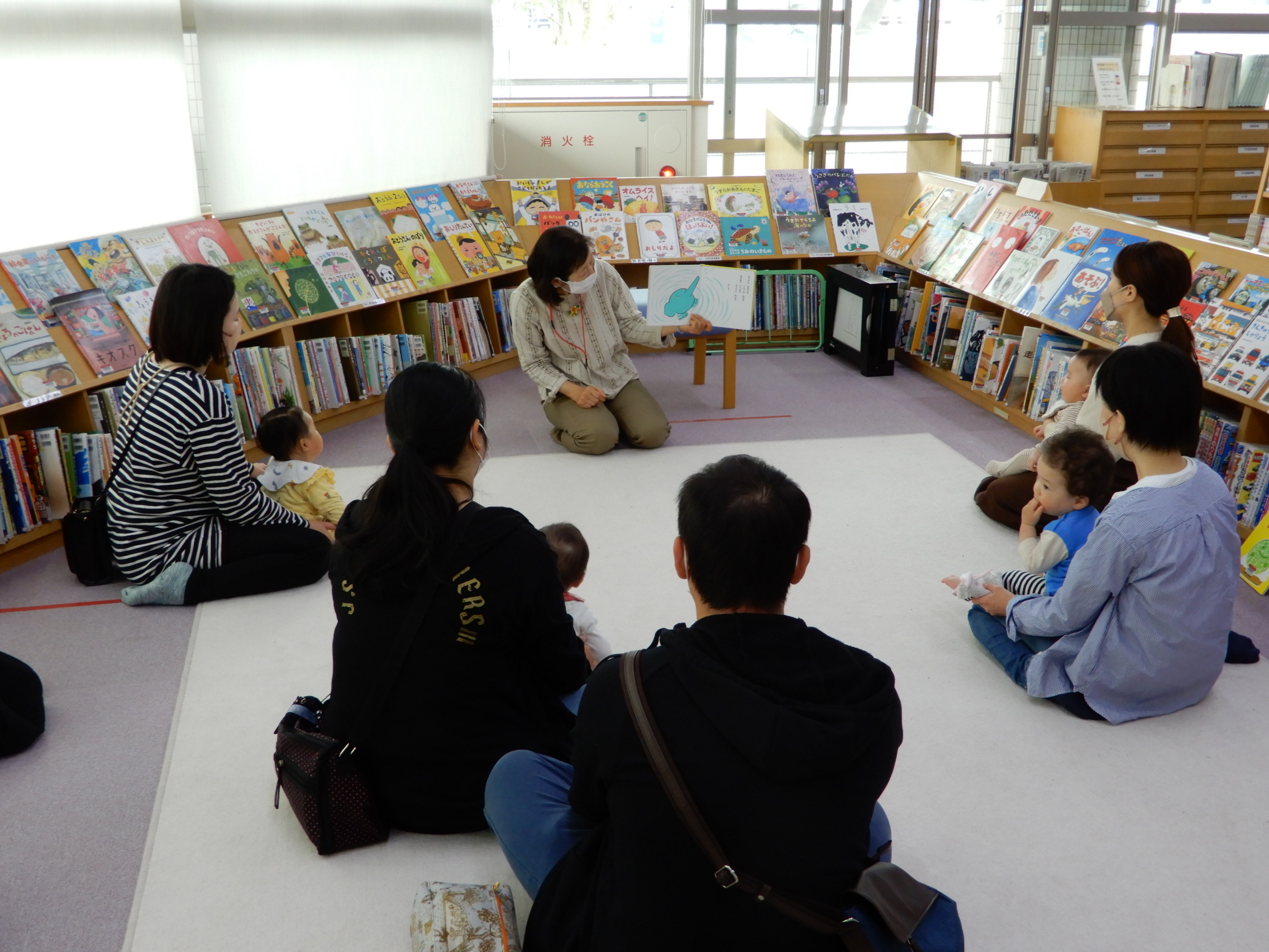 お父さん、お母さん、赤ちゃんみんな集まっておはなし会が始まりました。