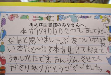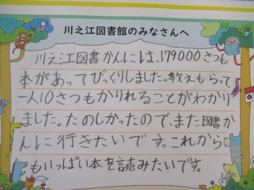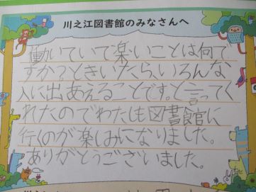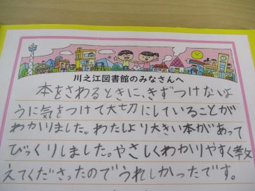 NPO法人 紙のまち図書館 > 新着情報 > 心温まるお手紙をいただきました 心温まるお手紙をいただきました 2024.07.21更新 イベント 川之江図書館 先日、図書館見学にきてくれた小学2年生からお手紙をいただきました! とても丁寧に書いてくれて心が温まりました^^ 川之江図書館に来てくれてありがとうございました。 いつでも遊びに来てくださいね☆
