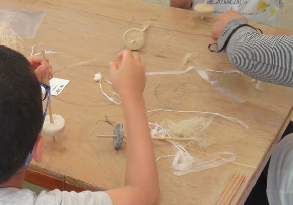 つづいて、紡錘車を使って繊維に撚りをかけ、糸をつくりました。