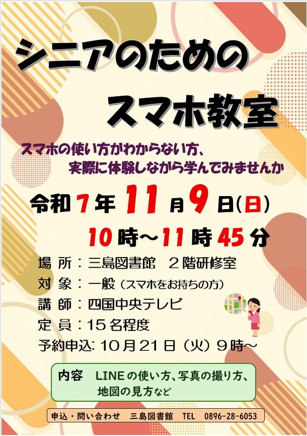 NPO法人 紙のまち図書館 > 新着情報 > 申込10/21(火)より『シニアのためのスマホ教室』 申込10/21(火)より『シニアのためのスマホ教室』 2025.10.09更新 イベント 三島図書館 2025年11月9日(日)午前10時~11時45分 三島図書館 2階研修室 一般(スマホをお持ちの方) ◆参加無料 ♢LINEの使い方、写真の撮り方、地図の見方など♢ 15名程度 10月21日(火)午前9時~ 三島図書館(電話 0896-28-6053 または直接来館)
