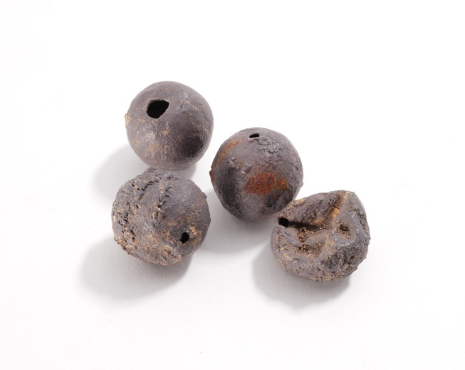 金属製の玉類は、半球状に成形した2つのパーツを接着してつくられ、