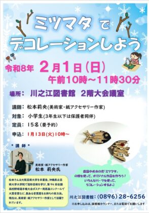 NPO法人 紙のまち図書館 > 新着情報 > 「ミツマタでデコレーションしよう」申込スタートしました♪ 「ミツマタでデコレーションしよう」申込スタートしました♪ 2026.01.13更新 イベント 川之江図書館 『ミツマタでデコレーションしよう』 申込開始日:1月13日(火) 10時~ 日時:2月1日(日)10時~11時30分 場所:川之江図書館 2階大会議室 講師:松本 莉央(美術家・紙アクセサリー作家) 内容:ミツマタの枝でオリジナル作品を作ろう! 対象:小学生 ※低学年は保護者同伴 定員:15名程度(要申込) 参加無料