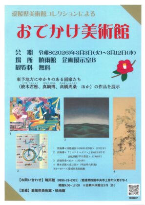 NPO法人 紙のまち図書館 > 新着情報 > 近日開催!!愛媛県美術館コレクションによる おでかけ美術館(3/3~3/12) 近日開催!!愛媛県美術館コレクションによる おでかけ美術館(3/3~3/12) 2026.02.14更新 お知らせ 暁雨館 愛媛県美術館コレクションによる おでかけ美術館 東予地方にゆかりのある画家たち(続木君樵、真鍋博、高橋周桑 ほか)の作品を展示します 会 期 令和8(2026)年3月3日(火)~3月12日(木) ※3/9(月)休館 場 所 暁雨館 企画展示室B 観覧料 無料 【お問い合わせ】暁雨館(0896-28-6325)/愛媛県四国中央市土居町入野178-1/開館9:00~17:00 【主催】愛媛県美術館・暁雨館